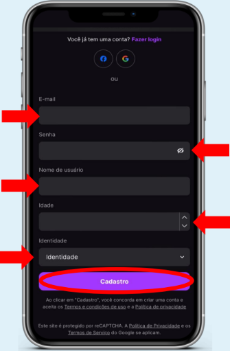 Insira os dados da conta que quer conectar ou da nova conta. Preencha todas as informações solicitadas no site e depois clique em “Cadastro”.