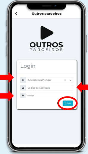 Selecione o seu provedor de internet e insira o login e senha fornecidos pelo parceiro. Clique em “Entrar”.