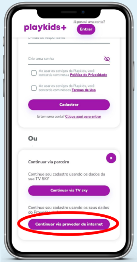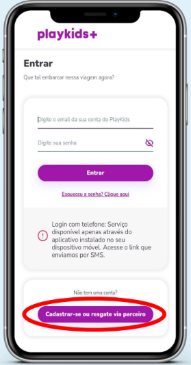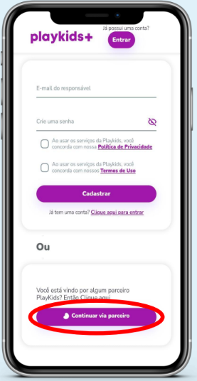 Cadastre seu e-mail e senha, concorde com os termos de uso do app e clique em “Criar conta PlayKids”.