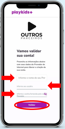 Digite o nome do seu provedor e clique nele. Feito isso, insira login e senha fornecidos pelo seu provedor e clique em “Validar”.