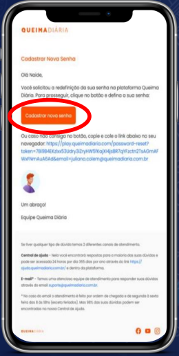 Acesse seu e-mail e clique no botão “Cadastrar Nova Senha”. Caso necessário, verifique sua conta e então cadastre uma nova senha.
