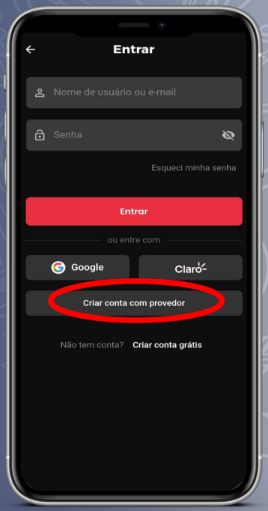 Em seguida, selecione “CRIAR CONTA COM PROVEDOR”.